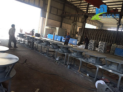 抗拉拔支座中的相对滑移部件之间,选用现在世界上摩擦系数很低的聚四氟乙烯滑板和不锈钢板相隔,充沛减小了摩擦阻力,使各部分之间的运动流转,避免爬行现象的发生。本类抗拉拔支座通过球面聚四氟乙烯滑板上部构件沿着球面相对于下部构件的翻滚结束转角(常用值为0.02rad)。